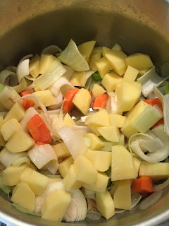 - Numa panela, coloquem o alho francês e a cebola às rodelas