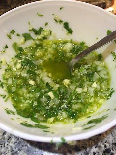- De seguida, prepara-se o molho. Piquem 3 alhos finamente para uma taça