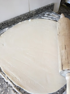 - Numa superfície limpa, polvilhem farinha e estiquem a massa