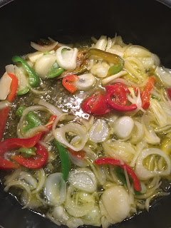 - 1/2 pimento cortado às tiras (usei 1/4 de vermelho e 1/4 de verde)