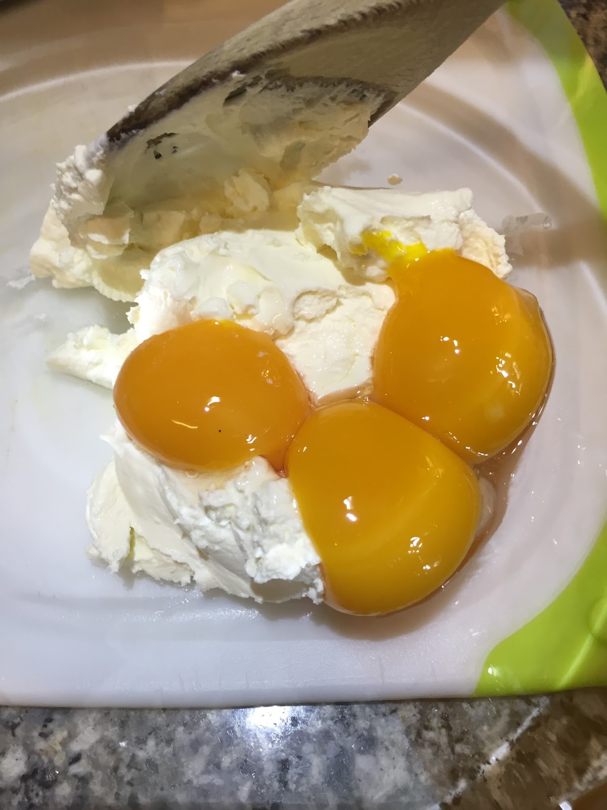 - Numa taça, juntem as gemas com o queijo e adicionem uma pitada de sal