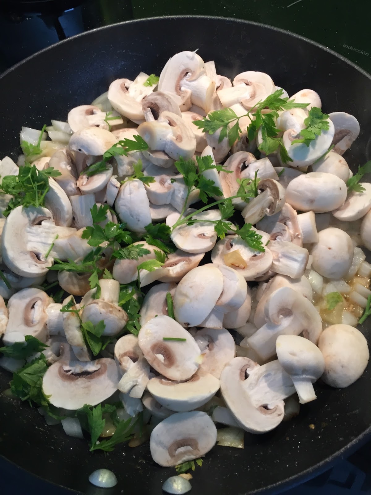 - Juntem os cogumelos fatiados e metade da salsa depois de picada