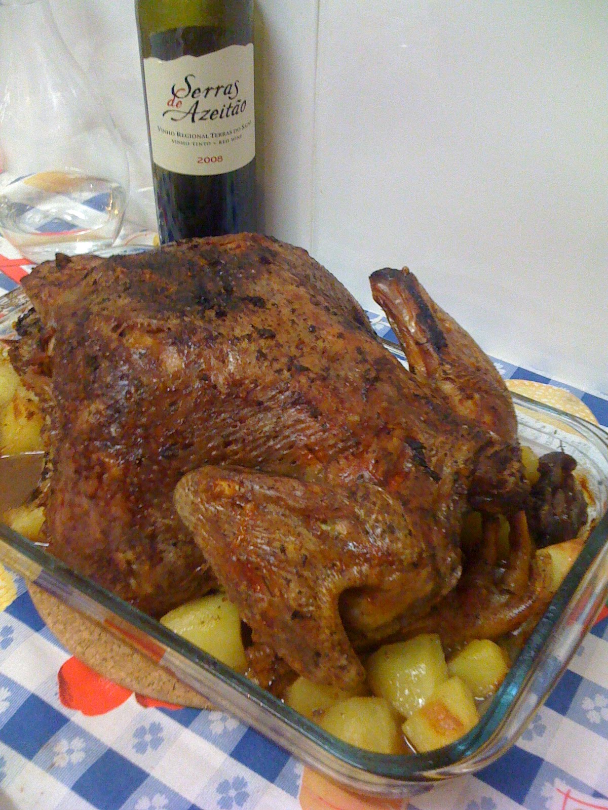 Eu tive a necessidade de atar as patas ao bicho, porque ele mesmo depois de morto, teimava em não caber no raio do tabuleiro! :D Levem ao forno durante 30 minutos.